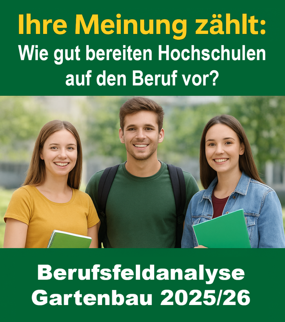 Die Berufsfeldanalyse Gartenbau wird seit 1996 regelmäßig durchgeführt – und liefert den Hochschulen entscheidende Hinweise darauf, wie gut sie ihre Studierenden auf den Beruf vorbereiten. Mit Ihrer Teilnahme helfen Sie: